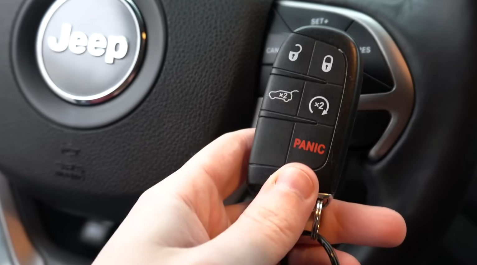 If the key fob battery dies, the Jeep can still start without replacing it right away. Remove the mechanical key to unlock the door, then sit inside with the fob. Press the brake pedal and push the rounded end of the fob against the start button. The vehicle should start as usual.