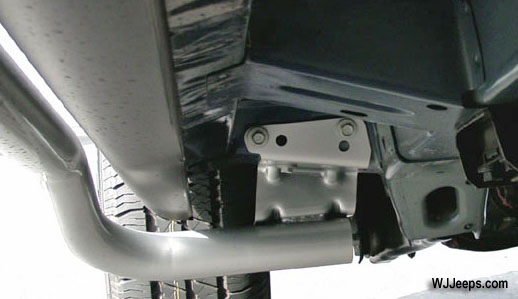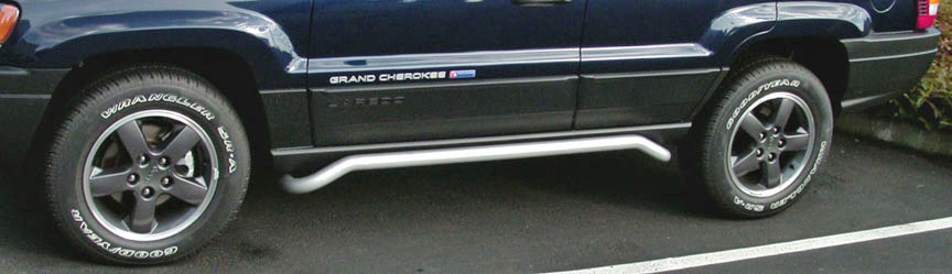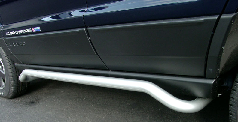 Close-up views of the Freedom Edition’s Radiant Silver Metallic tubular side rails which feature a semi-flat finish. The same style rails, but in a polished finish, are also available (as a Mopar accessory) and can be installed on all WJ models 1999-2004. Models prior to 2002 may require mounting holes to be drilled.