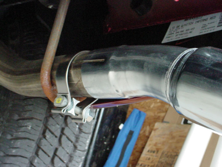 1. With a sawsall or equivalent, cut off 7-1/2″ of the existing factory tailpipe, as shown in the photo. Follow the curve of the pipe to obtain the measurement and mark with a grease pen.