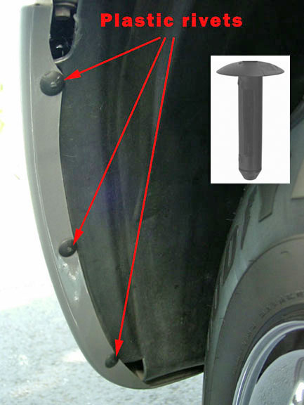 The rivets used to attach the fascia to the wheelwell liners are as much as $3.50 each at some Jeep dealers (part # 6034608). You can get identical rivets for far less at auto body supply shops, they are made by Marson Corp. and are called Klik-Loktm Plastic Rivets, part # MA48150 (or 58150). Marson also makes a tool for installing the rivets, Plastic Rivet setter # MA48000. The rivets however can be installed without the tool, by simply pulling on the end with a pair of pliers while holding the rivet base in place, although they will not be quite as tight as with using a rivet gun. Note: The Marson rivet gun is available online at Keytone.com for $23.52 plus shipping. A 20-pack of rivets from the same vendor is only $5.31.