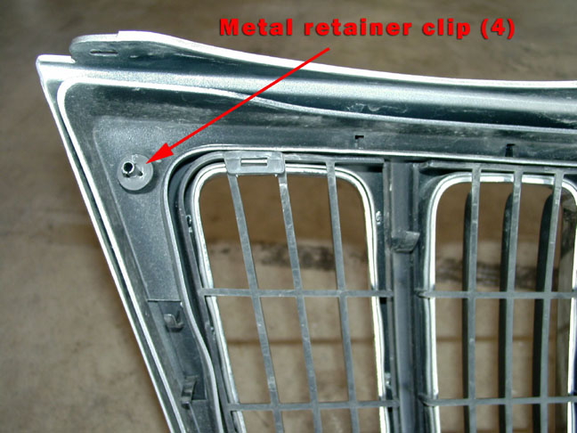 7. To separate the outer grille from the fascia, remove the three screws inside the lower front part of the grille with a 7mm socket. From the back, support as necessary, disengage the plastic clips and pry off the four metal attachment washers. These washers can be stubborn to remove but prying them up alternating on the sides with a flat-blade screwdriver will usually do the trick.