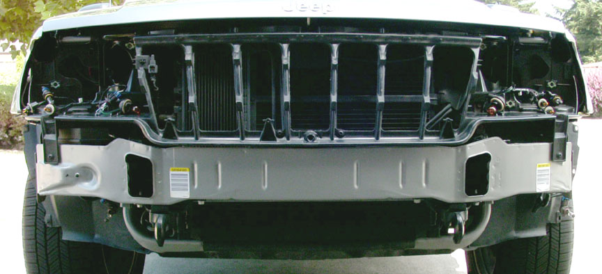 WJ front end shown without grille, and with and without headlight assemblies installed.