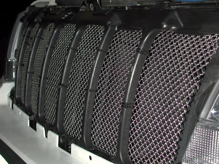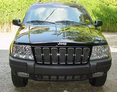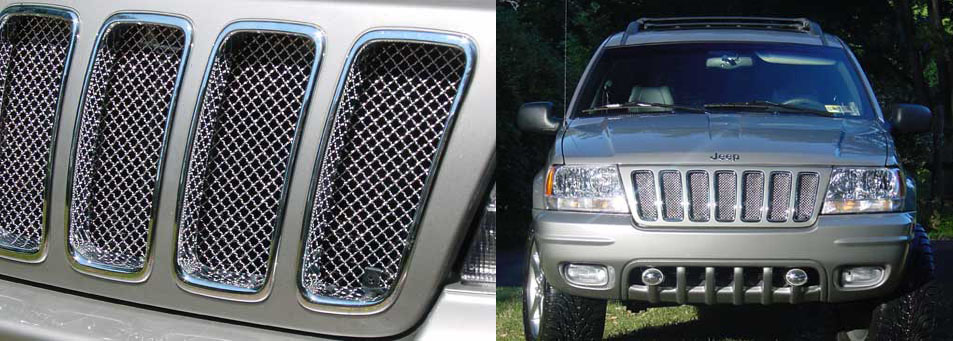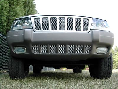 A popular modification among Grand Cherokee owners is a metal insert that is placed behind the factory grille. Several different styles are available and the inserts can be added to any model and year WJ grand Cherokee. Shown below are some of the choices available on the market, from custom manufactured inserts to inexpensive mesh that can be purchased at Home Depot type stores. Most inserts can be installed without removing the fascia, although taking the fascia off makes installation much easier. Fascia removal only takes about 10 minutes, less time than you would spending trying to work the insert into to a tight area. Instructions for removing the grille, or loosening it up enough to access it from behind, can be found on the Grille and fascia removal page.NOTE: Extreme caution should be used when handling wire mesh as the edges can be very sharp. It is highly recommended that protective gloves be worn when performing a wire mesh insert installation.