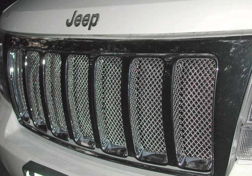 Jeeps Unlimited member BigJamesProp used aluminum gutter guard for the insert on his 2002 GC Special Edition. The top row of mesh was formed around the openings of the chrome piece and then just sandwiched between the grille and the grille backing. It is held in place without any attachments. The lower mesh was also formed around the openings, and then hot-glued around the edges to keep it firmly in place.