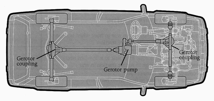- Gerotor pump in the transfer case transfers power immediately to the front axle when wheel slip is detected. provides four-wheel drive power automatically, with no driver input