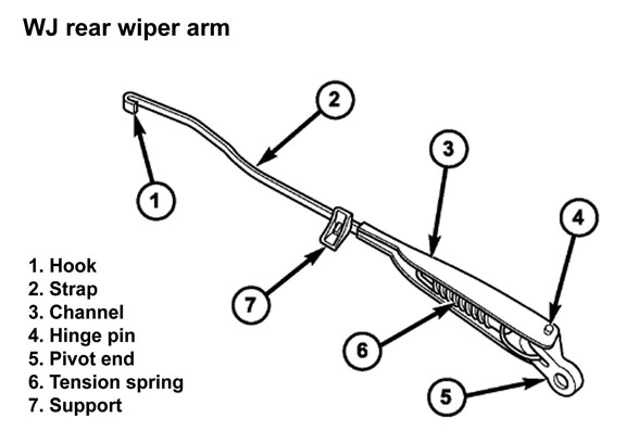 | NOTE: All Grand Cherokee WJ models have a single 12-inch rear wiper blade with a non-replaceable rubber element (squeegee). The wiper blade cannot be adjusted or repaired. If faulty, worn, or damaged the entire wiper blade unit must be replaced. |