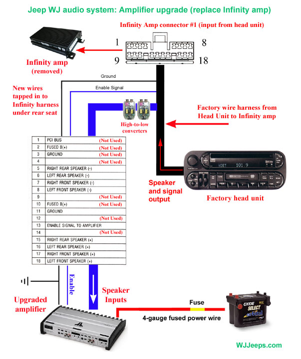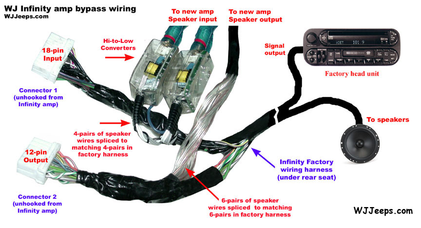 Installation of a replacement amplifier without using an OEM-1 adaptor requires tapping into both the 8 audio output and the 12 speaker wires in the Infinity harness at the existing Infinity amp location and adding signal level converters (as shown in the diagrams below). New wiring can also be run from the new amp to the speakers as some owners do for their installations, but this involves a lot of extra work and is not really necessary for most applications.