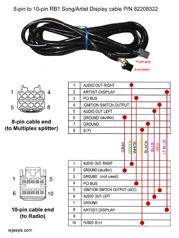 NOTE: Installion kit I is required when using this cable. This 8-pin to 10-pin harness cable must be installed and fed from the multiplex splitter near the satellite receiver up to the radio head unit. When this cable is installed in a vehicle WITH the factory CD changer, the factory radio to cd changer 10-pin to 8-pin wiring harness is bypassed and no longer used. When this cable is installed in a vehicle WITHOUT the factory CD changer, it is connected from the Sirius multiplex splitter to the radio. A CD changer is NOT required to be hooked up in order for the Artist display feature to function. Jeep Liberty note: This cable is not required to activate the Artist/title display function when installing the RB1/Sirius system in Jeep Liberty vehicles WITH the factory CD changer.
