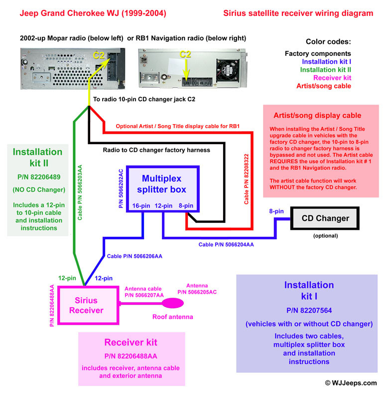 Adding the Sirius system to a WJ Grand Cherokee requires the Receiver/Antenna package plus one of the vehicle specific installation kits. An Artist/Song Title/Station display upgrade cable is an available option when using the RB1 Navigation radio.