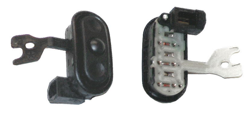 5. If you are replacing the radio button, it is removed by pressing it out through the back. Press firmly and evenly outward on the back of the switch to unsnap its side tabs from the mounting hole. Note that the radio switches have a plastic arm that is aligned onto an anchor post. When removing and reinstalling these switches be careful not to break the arm, although it is somewhat strong. When installing the radio remote switches make sure that they are seated firmly in the mounting hole. They need to be pressed hard to “snap” them in place.