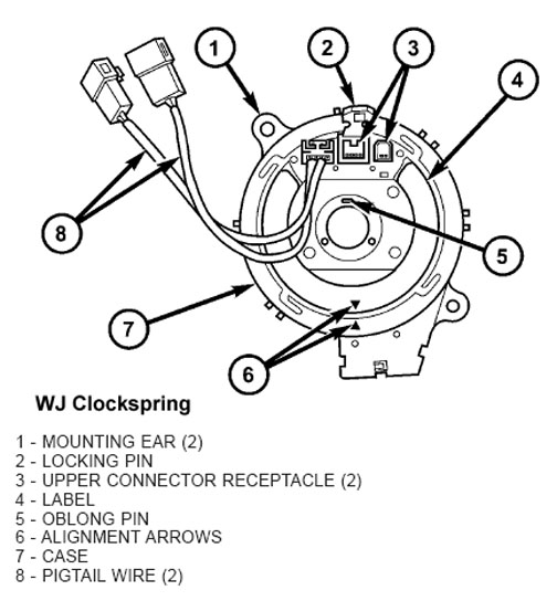The clockspring is a mechanical electrical circuit component that is used to provide continuous electrical continuity between the fixed instrument panel wire harness and the electrical components mounted on or in the rotating steering wheel. On the Grand Cherokee WJ the rotating electrical components include the driver airbag, the horn switch, the speed control switches, and the remote radio switches, if the vehicle is so equipped. The clockspring case is positioned and secured to the multi-function switch mounting housing near the top of the steering column. The connector receptacles on the tail of the fixed clockspring case connects the clockspring to the vehicle electrical system through two take outs with connectors from the instrument panel wire harness.