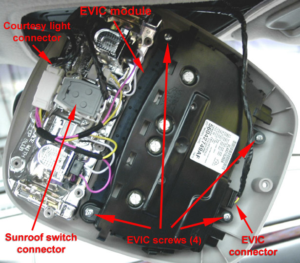 4. To completely remove the overhead console, disconnect the EVIC harness, courtesy light harness, and the sunroof switch connector.