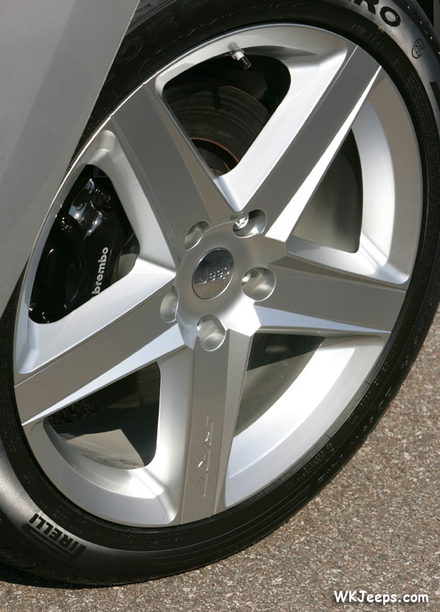 Contributing to its aggressive appearance, while providing both a cosmetic hype and genuine performance boost, the Grand Cherokee SRT-8 is equipped with larger diameter, unique five-spoke 20-inch forged aluminium wheels shod with high-performance 245/45 ZR20 all-season tyres, with a run-flat capability.