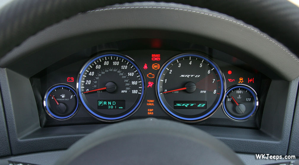 Other SRT-only trim includes a special ‘carbon-fibre technical’ leather trim for a more positive grip, which is applied to the steering wheel and gear selector. The centre stack features a unique finish in ‘refined aluminium’ which is also applied to shifter console and door-switch bezels. The steering wheel frames comprehensive instrumentation, including a 180 mph (290 km/h) speedometer, tachometer and engine temperature gauges, all trimmed with a blue accent and located in a carbon-fibre trimmed binnacle.