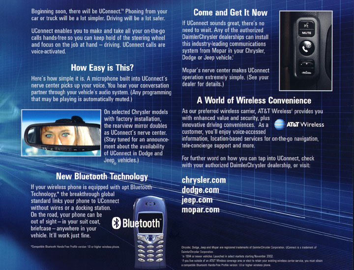 UConnecttm, Chrysler Group’s in-vehicle, hands-free, voice-activated communications system, debuted in the fall of 2002 as a Mopar accessory, dealer-installed option for the 2003 Grand Cherokee and other selected Chrysler vehicles. The system features the Bluetoothtm global standard technology, which links your cellular phone with UConnect without wires or a docking station. Starting with 2005 models, the system can be integrated into the optional Navigation radio.