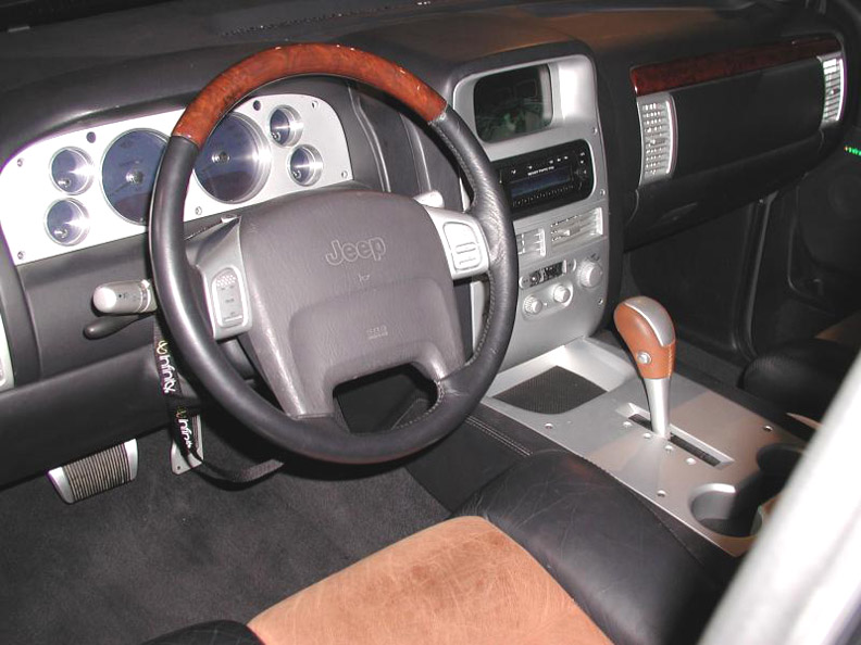 Although the instrument panel is actually modified from the Jeep Grand Cherokee, most Grand Cherokee owners would not recognize it due to the added materials and colors. The instrument panel is detailed with chrome and a brushed aluminum surface similar to the 1998 Plymouth Pronto Spyder concept car. Select use of light burl wood on the steering wheel and instrument panel also accent the interior. Navy blue is the primary color of the interior and seats with contrasting cognac leather trim inserts.