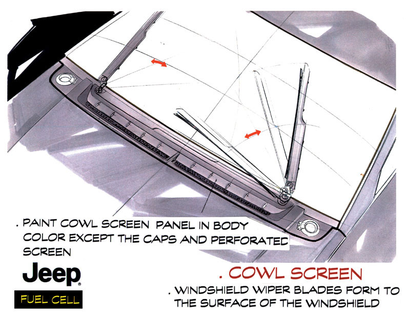 But how do you make a Jeep vehicle aerodynamic? The Jeep design team developed several unique features to improve aerodynamics. A special heat exchanging cowl panel does double duty. First, it helps lower drag by improving wind flow over the windshield. Second, it draws hot air out from under the hood and aids the radiator in keeping the fuel cell system cool. At highway speeds, a rear spoiler deploys from the roof, similar to the 1998 Dodge Intrepid ESX2 concept. An “on-demand” roof rack can be activated when needed for luggage, although its normal position makes it flush with the roof. An underbelly pan smoothes the air flow under the vehicle.