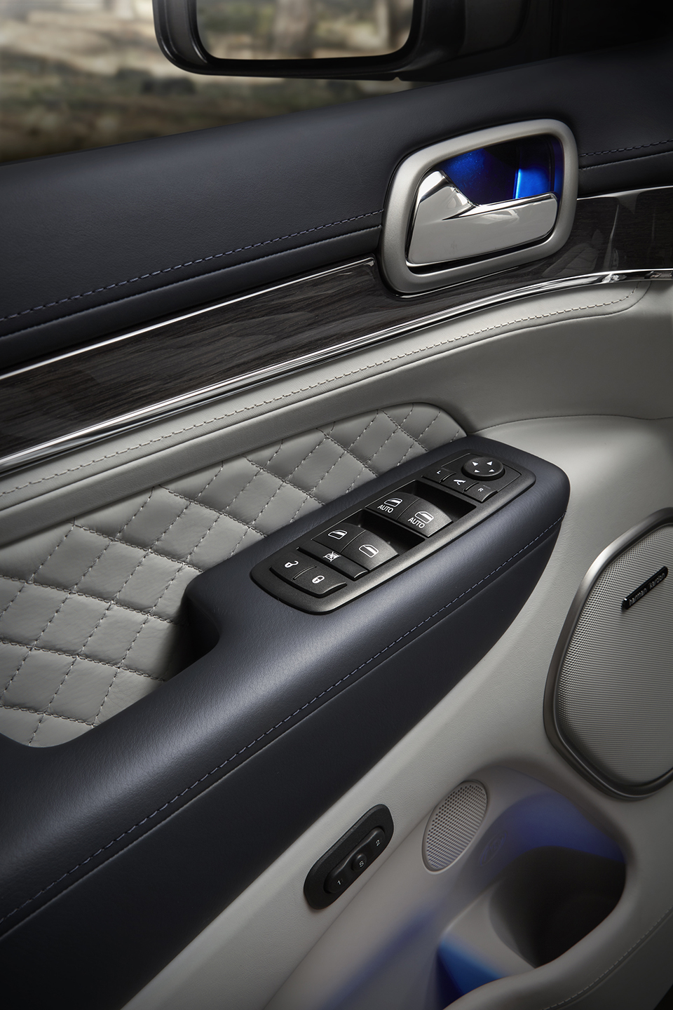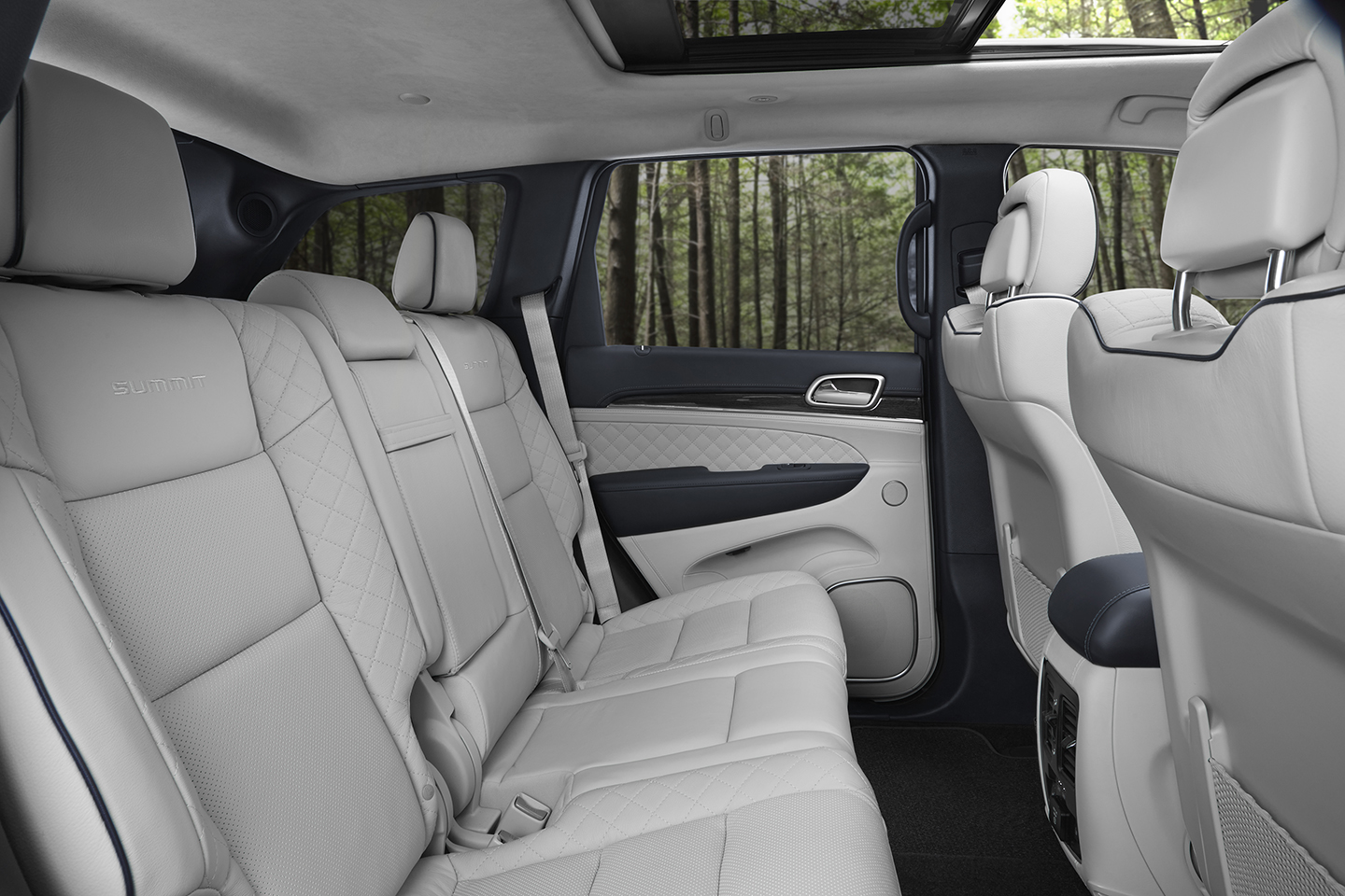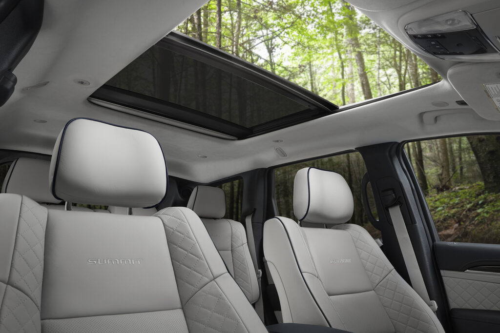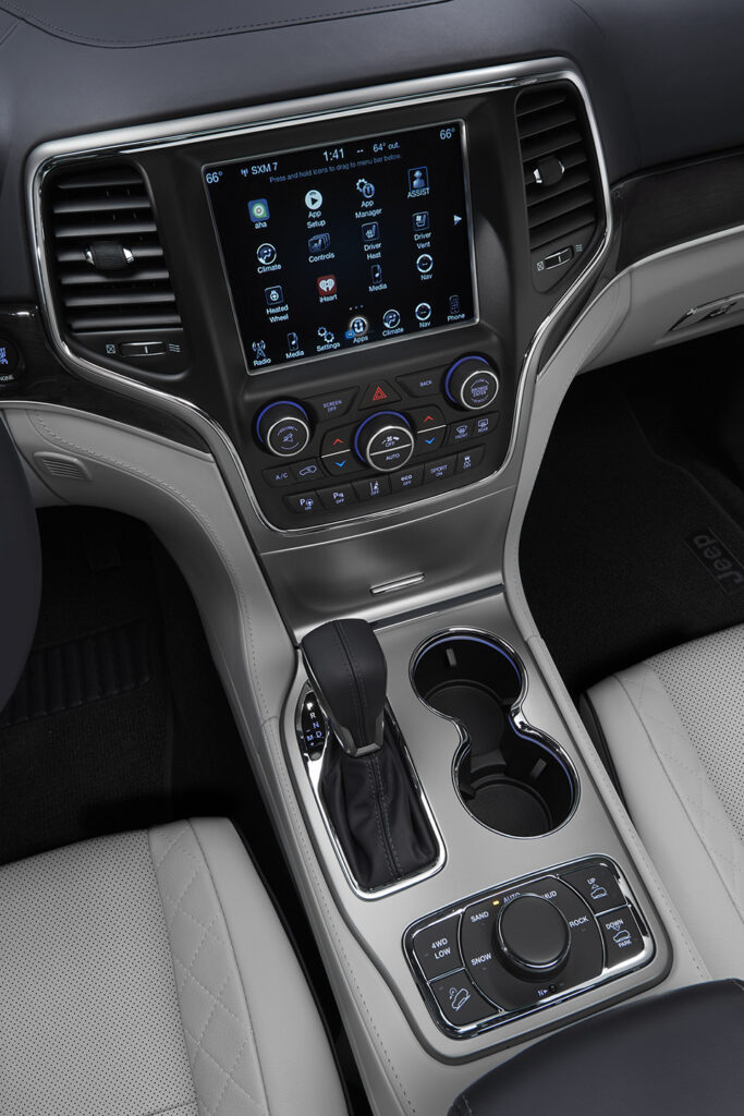 The Grand Cherokee Summit’s exterior boasts a new look with an updated front fascia, grille and LED fog lamps, with new 20-inch polished aluminum wheels. A stunning new full-wrap Laguna leather interior in Indigo and Ski Gray is one of four color schemes. The full leather interior boasts a Nappa leather-wrapped dashboard, center console and door panels, and Laguna leather seats with edge welting.