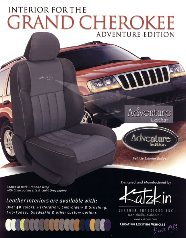 Katzkin Leather Interiors (Montebello, California) is a manufacturer of custom leather interiors for a wide variety of vehicles. A wide variety of different colors are available in a series designated as the “Jeep Grand Cherokee Adventure Edition”. The high-quality leather seating material is designed to be installed with a minimal amount of stitching required. An exterior name badge is also included in the package. For further information visit Katzkin’s web site.