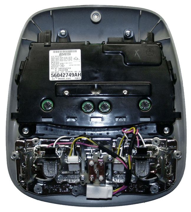 Above left, overhead console with EVIC, reading lights and sunroof switch. The center photo shows the back of the console. The EVIC module is attached to the rear with four screws. The close-up photo at far right shows in detail the dual reading lights, sunroof switch (if equipped) and associated wiring.