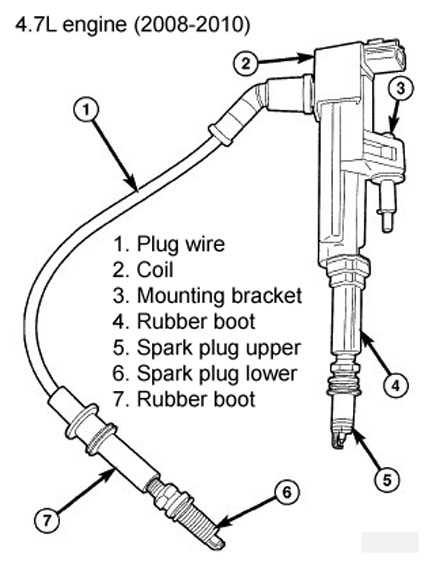 The 4.7L V-8 engine uses a separate ignition coil for each cylinder. The one-piece coil bolts directly to the cylinder head. Rubber boots seal the secondary terminal ends of the coils to the top of all 8 spark plugs. A separate electrical connector is used for each coil.