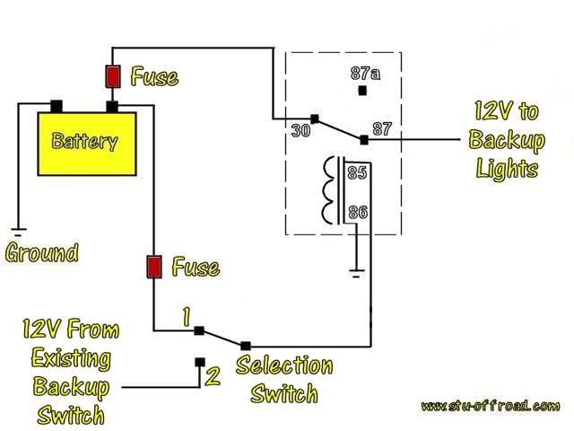 The above wiring diagram provides you with two methods by which to control your vehicle’s new backup lights. When the Selection Switch is in position 1, 12 volts is applied to the power relay’s coil and causes it to energize. The 12V on pin 30 is applied to pin 87 and that 12V is then applied to the new backup lights.