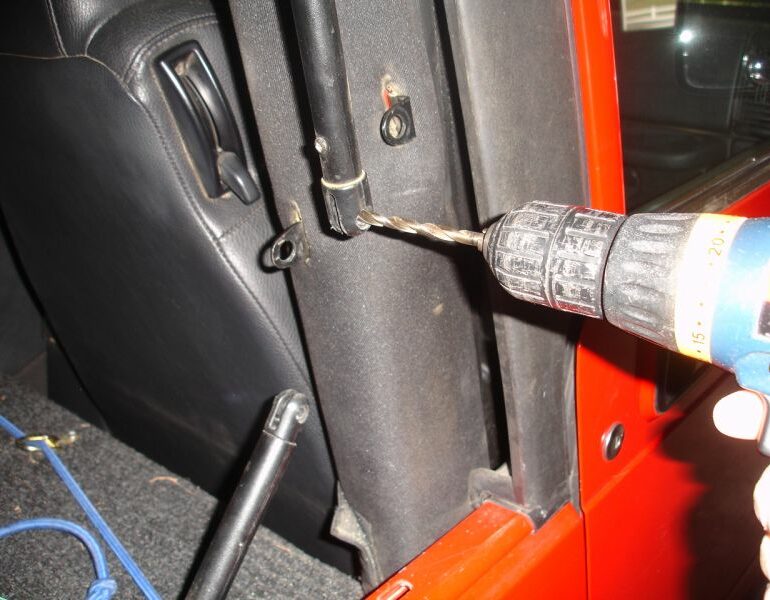 Drill a 9/32″ hole through the same hole that the screw was just removed from. There is a nut molded into the back side of the plastic bracket that you must drill though. If the bit hangs in it, just keep the drill running and push the nut out of the back side of the bracket. The back side of the bracket won’t look real clean but nobody will see it anyway and it won’t effect the modification.