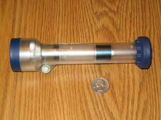 The flashlight comes in an 11 ounce, high strength, clear plastic housing. It contains no batteries, no bulbs, and the on/off switch consists of a small magnet that actuates a tiny reed relay on the inside of the housing. As such, the flashlight is waterproof to a depth of 430 feet (note that I would NOT consider this flashlight to be a useful diving light, having done some night scuba diving). It also floats so you won’t have to worry about testing its depth rating. The coin in the above picture is a US quarter.
